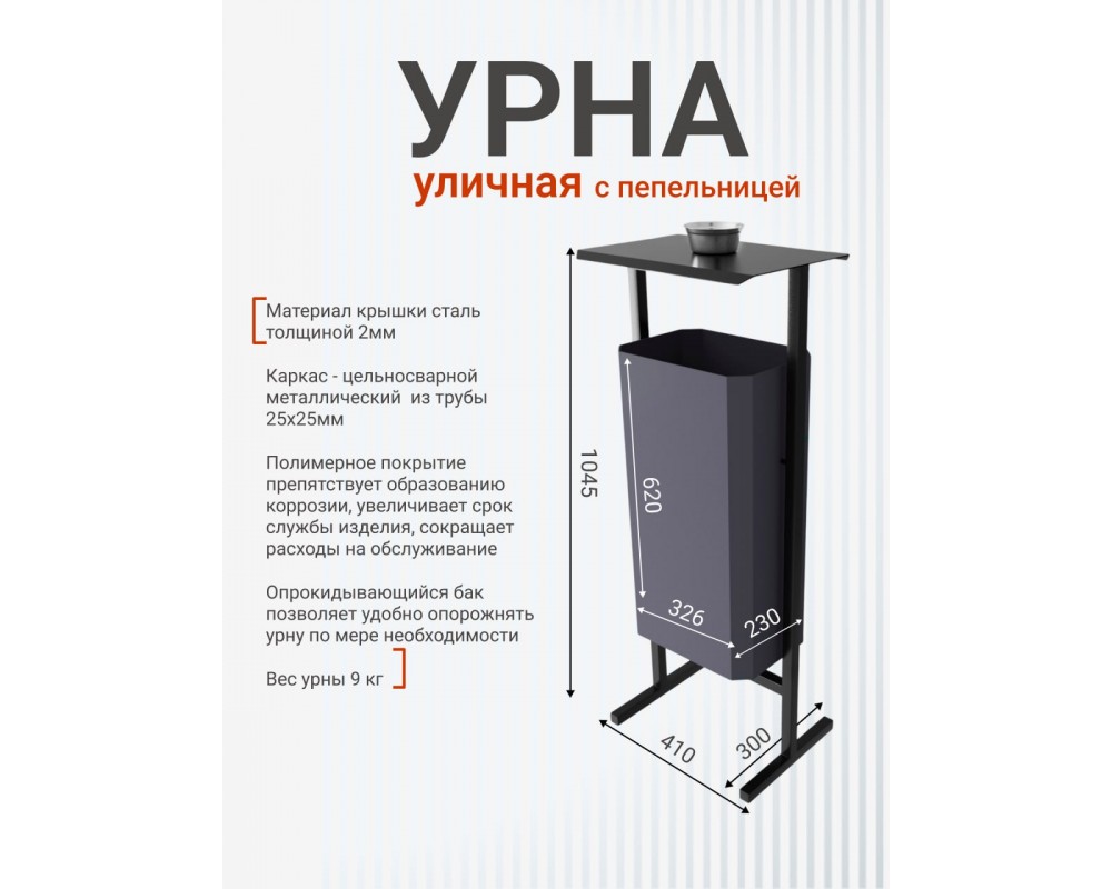 - Общие габариты урны: ДШВ 41 x 30 x 104.5 см