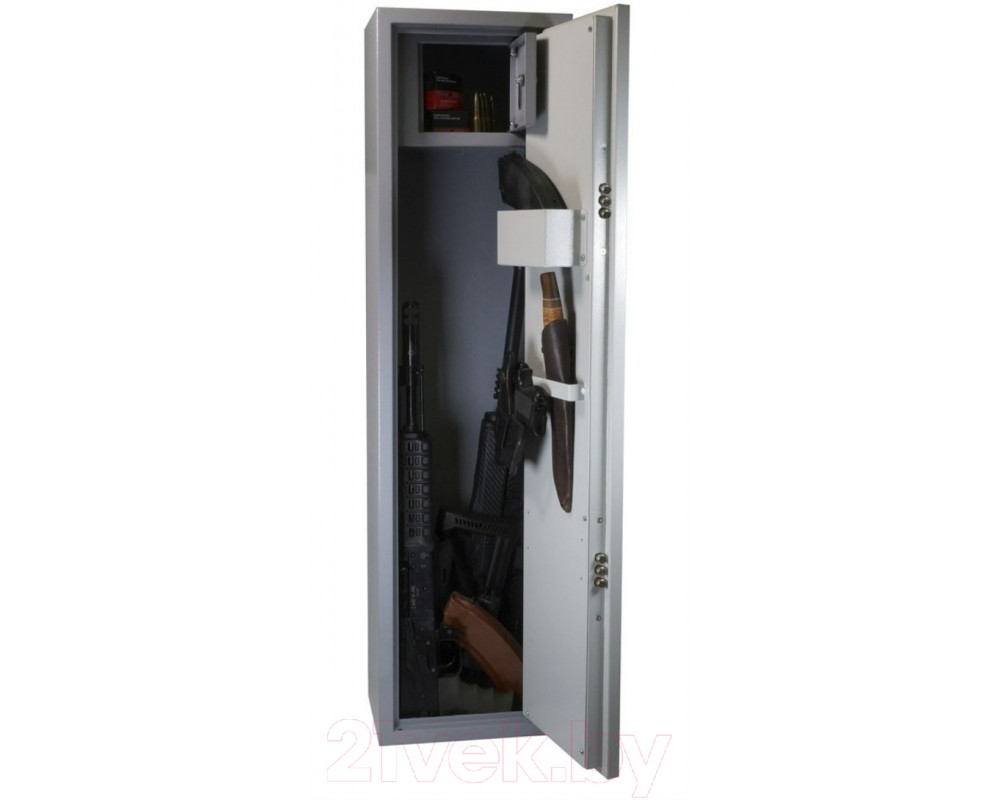 Металлический оружейный шкаф TakTika оснащен двумя надежными сувальдными замками повышенной секретности с тремя ригелями. Сейф позволяет хранить до двух ружей. Сейф имеет запираемый на ключ встроенный ящик под патроны, съемный карман для аксессуаров, а также скобу для инвентаря. Предусмотрены отверстия для крепления к полу и стене. Мягкий коврик позволит аккуратно и бережно устанавливать ружье без риска повредить приклад. Дверь усилена металлическим коробом, который не только закрывает замки, но и обеспечивает дополнительную жесткость конструкции, а так же позволяет перевешивать дверь справа налево. Максимальная длина оружия, размещаемого в сейфе — 820 мм. Шкаф покрашен износостойкой порошковой краской.