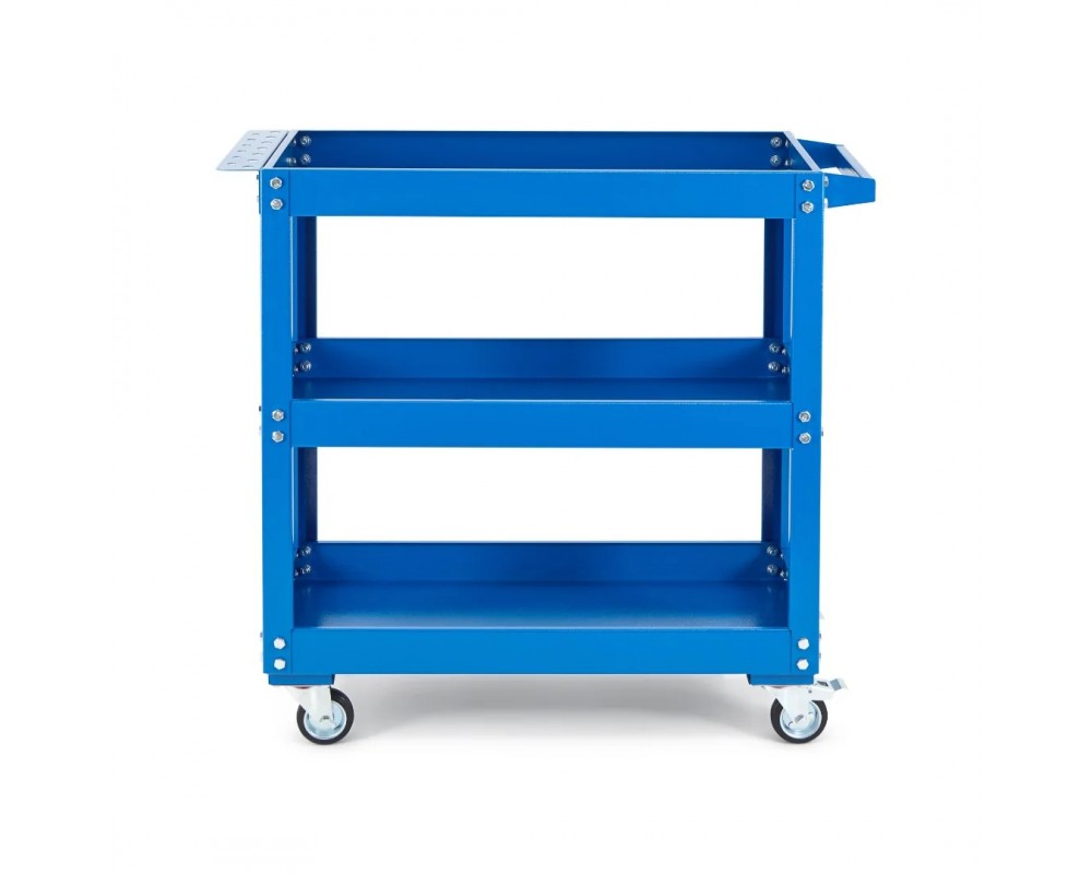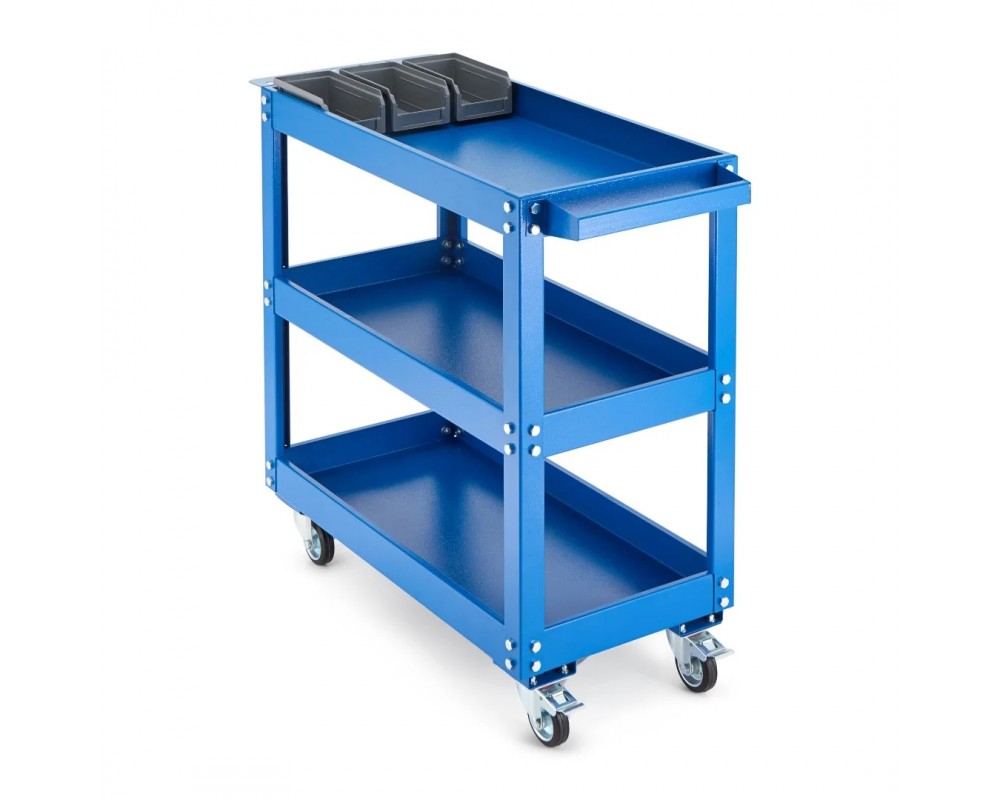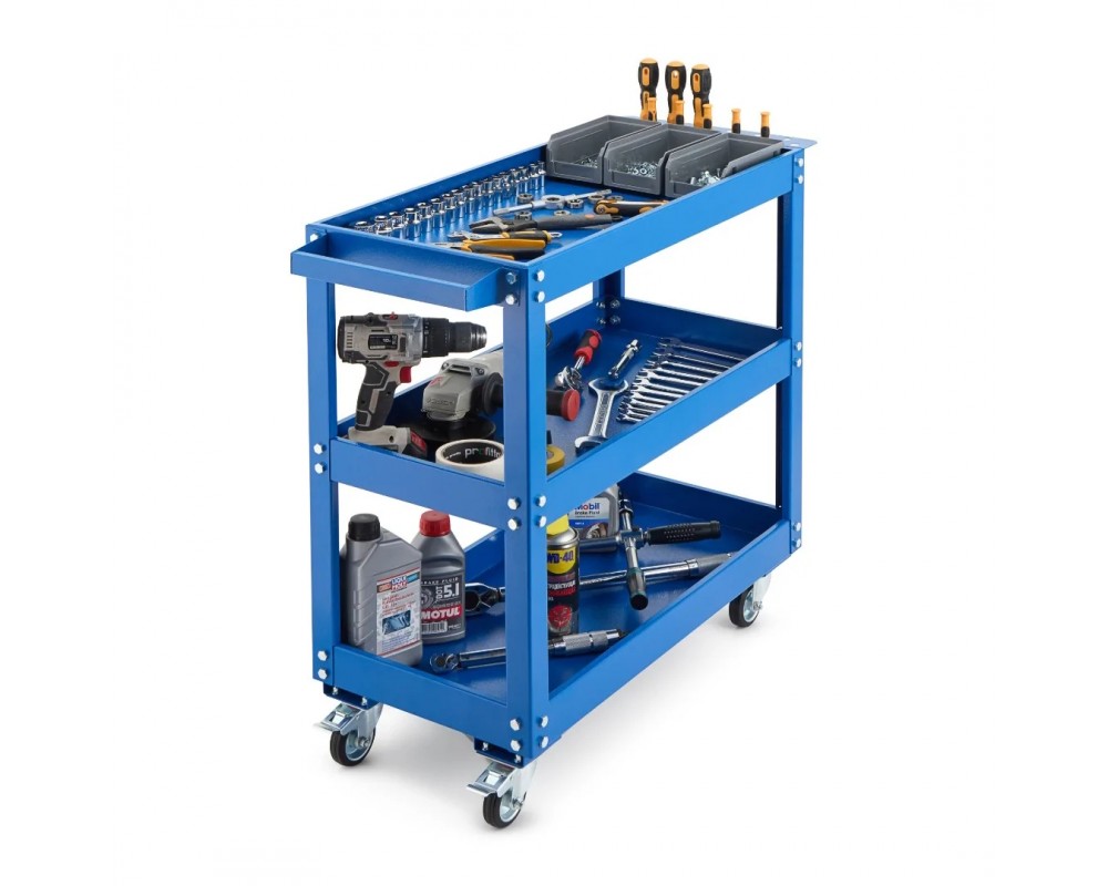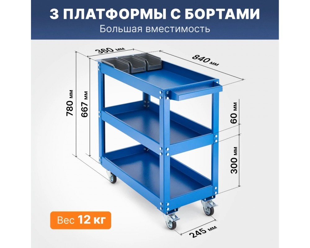 Компактные габариты (высота 775 мм, длина 703 мм, ширина 353 мм) делают тележку идеальным выбором даже для небольших рабочих пространств. Прочный металлический каркас с износостойким порошковым покрытием синего цвета защищает от механических повреждений и коррозии, позволяя использовать тележку как в помещении, так и на улице.