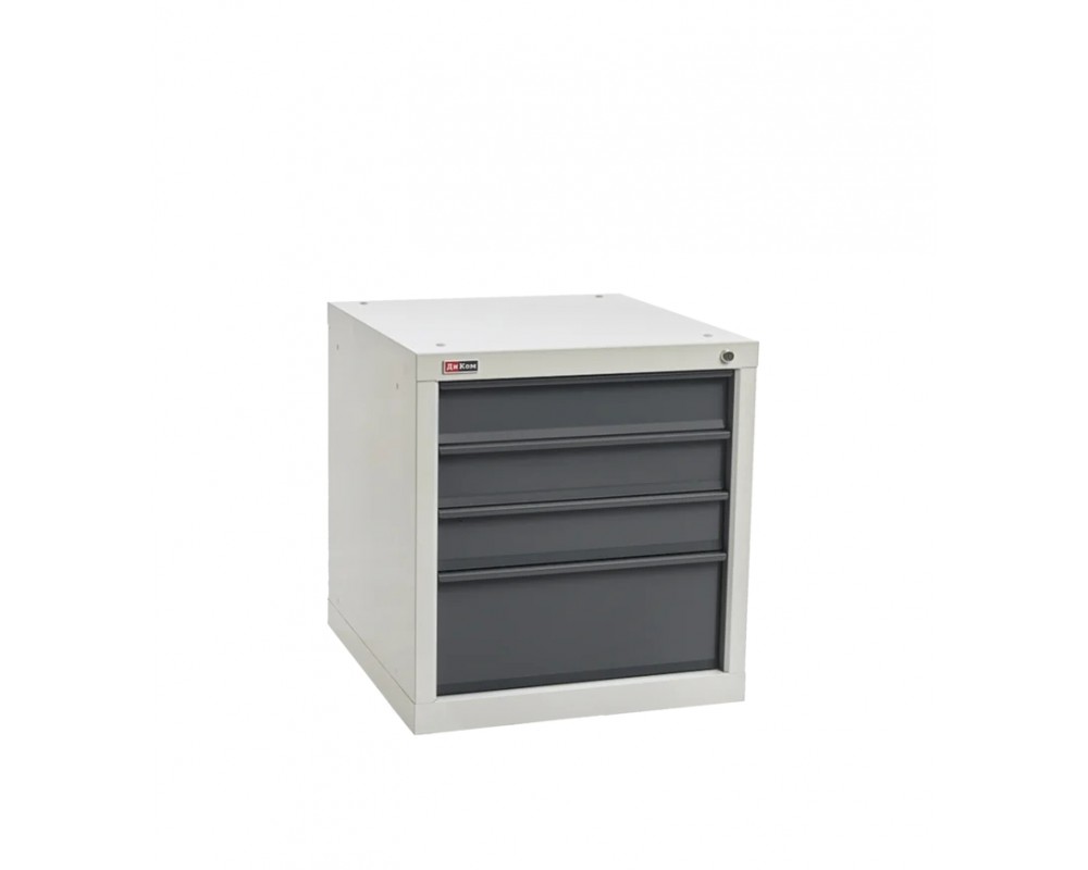 Тумба имеет 4 выдвижных ящика. Ящики закрываются на один общий замок. Максимальная нагрузка на ящик 40 кг.В ящики можно дополнительно приобрести лотки для ящиков. Окрашена порошковой краской: корпус — серый RAL-7038, ящики — синие RAL-5012.