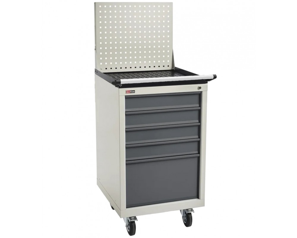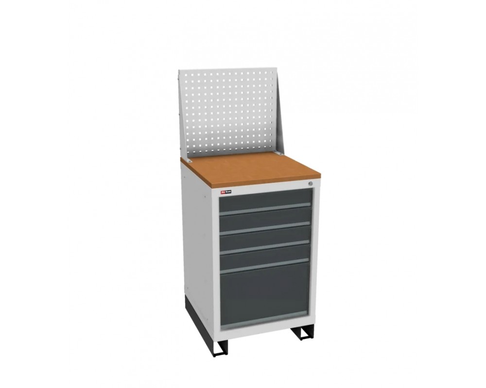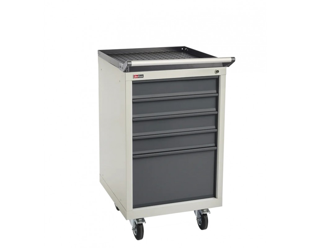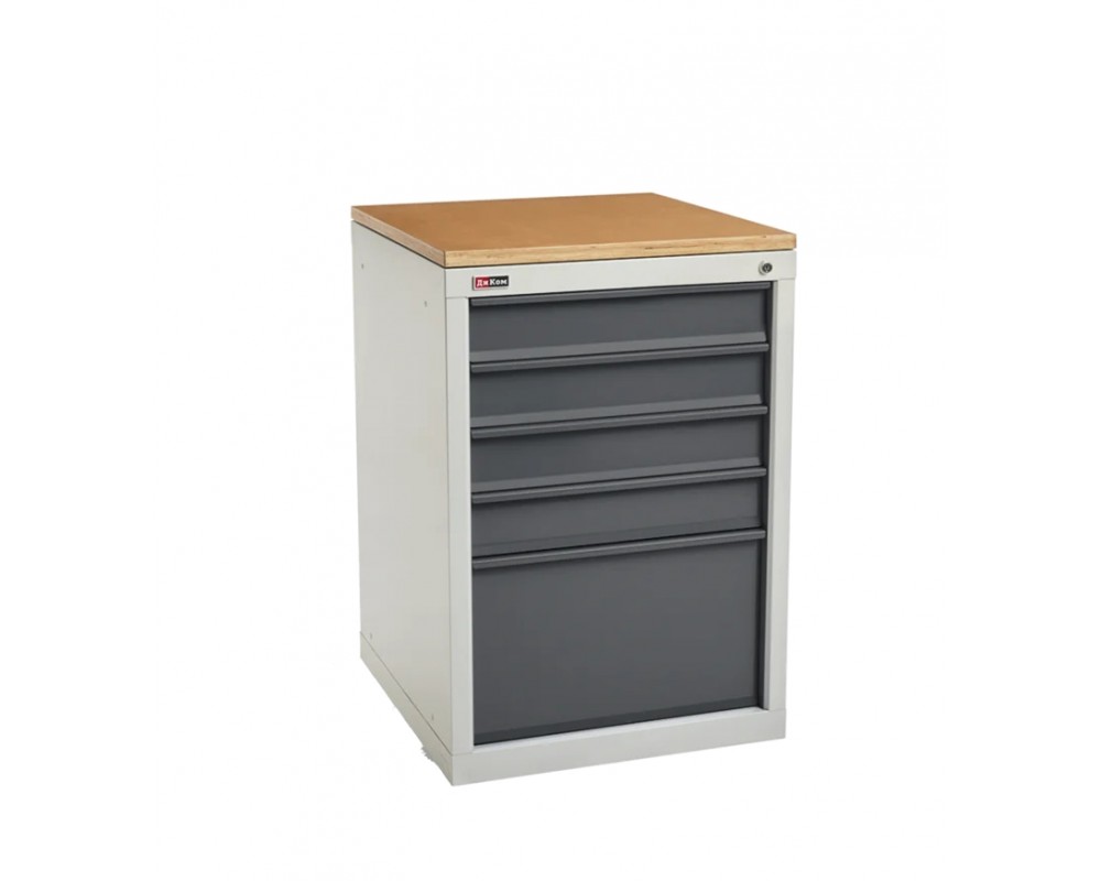Тумба имеет 5 выдвижных ящика. Ящики закрываются на один общий замок. Максимальная нагрузка на ящик 40 кг.В ящики можно дополнительно приобрести лотки для ящиков. Окрашена порошковой краской: корпус — серый RAL-7038, ящики — синие RAL-5012.