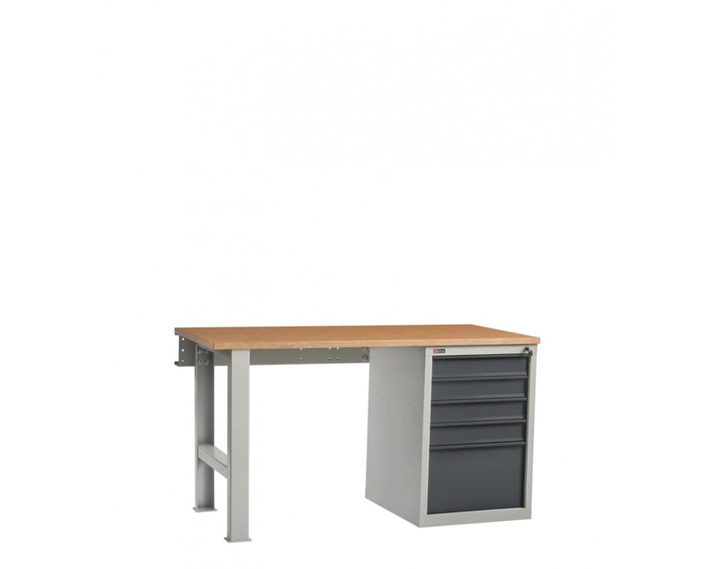 Столешница устанавливается на опоры. Верстак укомплектован инструментальной тумбой ВЛ-015 с 5 выдвижными ящиками. Максимальная нагрузка на ящик - 40 кг.