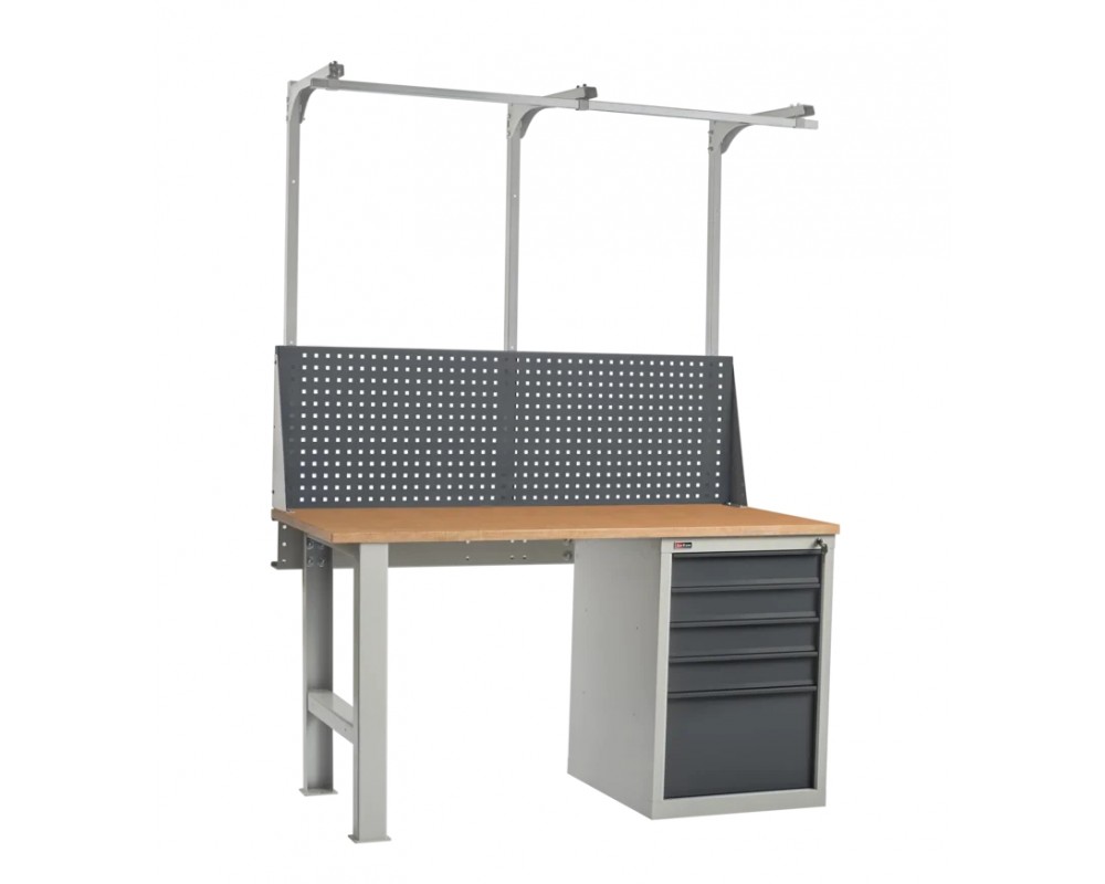Столешница устанавливается на опоры. Верстак укомплектован инструментальной тумбой ВЛ-015 с 5 выдвижными ящиками. Максимальная нагрузка на ящик - 40 кг.