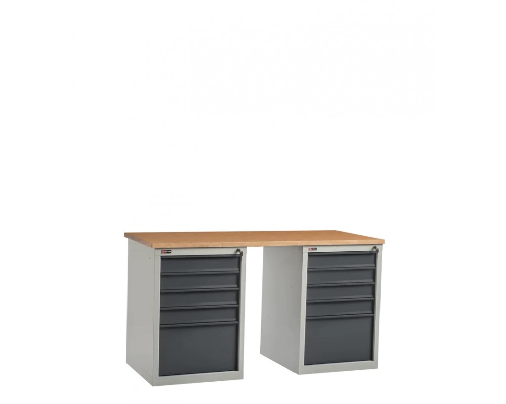 Столешница устанавливается на опору и инструментальную тумбу ВЛ-015 с выдвижными ящиками. Верстак укомплектован подвесной тумбой ВЛ-003 с 3 выдвижными ящиками.