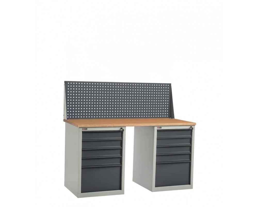 Столешница устанавливается на опору и инструментальную тумбу ВЛ-015 с выдвижными ящиками. Верстак укомплектован подвесной тумбой ВЛ-003 с 3 выдвижными ящиками.