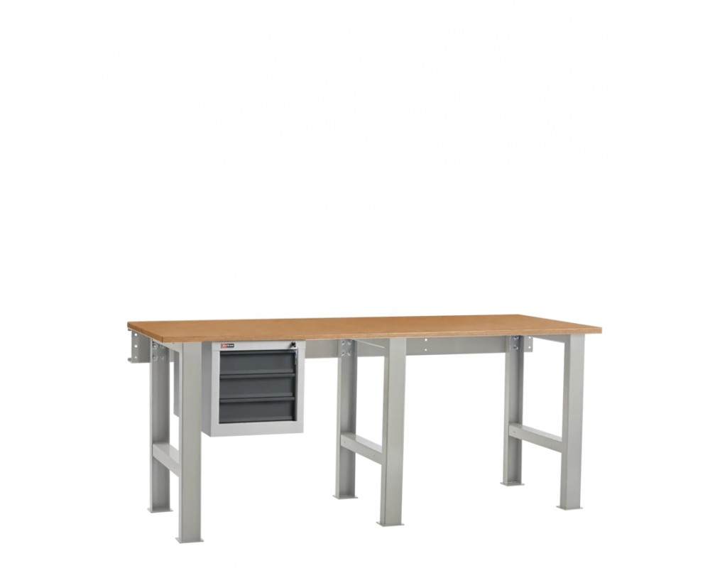 Столешница устанавливается на опоры. Верстак укомплектован подвесной тумбой ВЛ-003 с 3 выдвижными ящиками.