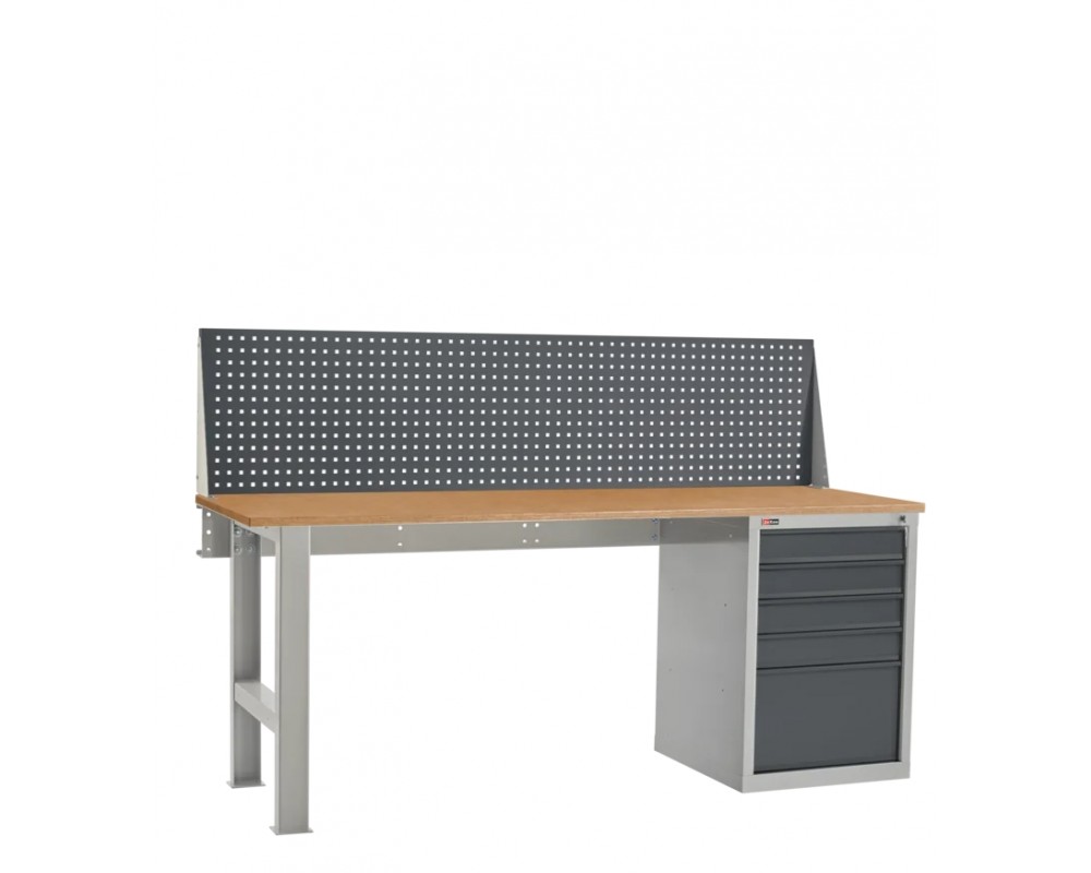 Столешница устанавливается на опоры. Верстак укомплектован инструментальной тумбой ВЛ-015 с 5 выдвижными ящиками. Максимальная нагрузка на ящик - 40 кг.