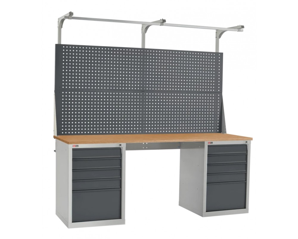 Верстак укомплектован перфорированным экраном и консолью. На экран с помощью зацепов можно установить аксессуары. На консоль устанавливается освещение или бегунок. Освещение состоит из энергосберегающего светодиодного светильника, который обеспечивает 1200 Lx на рабочей поверхности.