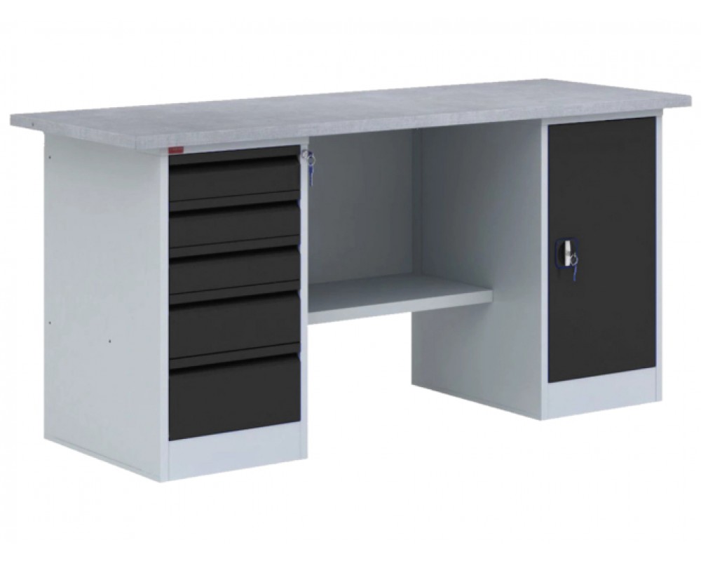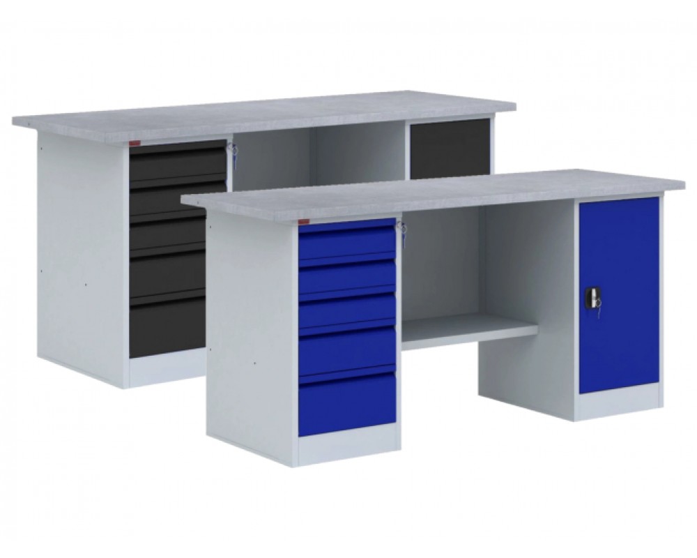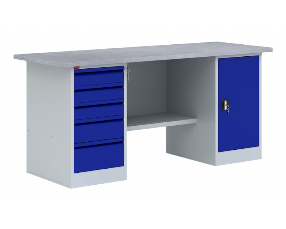Верстак слесарный двухтумбовый ВП-4 предназначен для установки в слесарных мастерских и на промышленных предприятиях. Металлический верстак оборудован запирающимися на ключ тумбой с съемными полками и драйвером с пятью выдвижными ящиками.