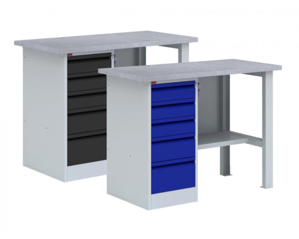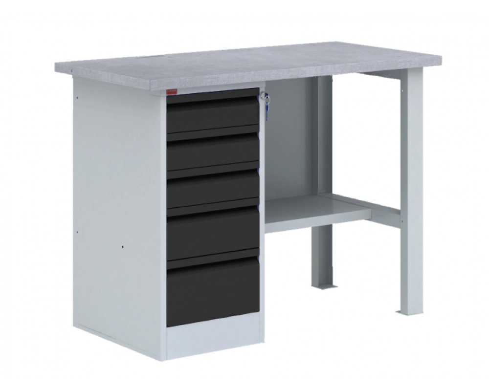Верстак слесарный однотумбовый ВП-3 предназначен для установки в слесарных мастерских и на промышленных предприятиях. Металлический верстак оборудован запирающейся на ключ драйвером с пятью выдвижными ящиками.