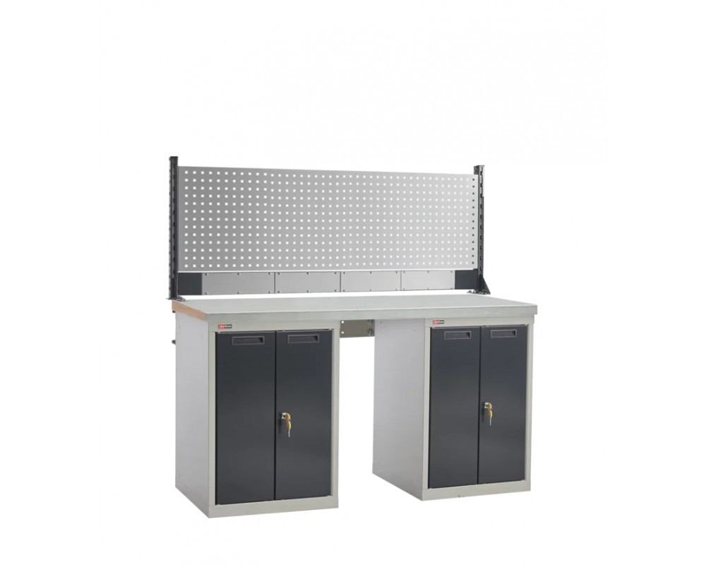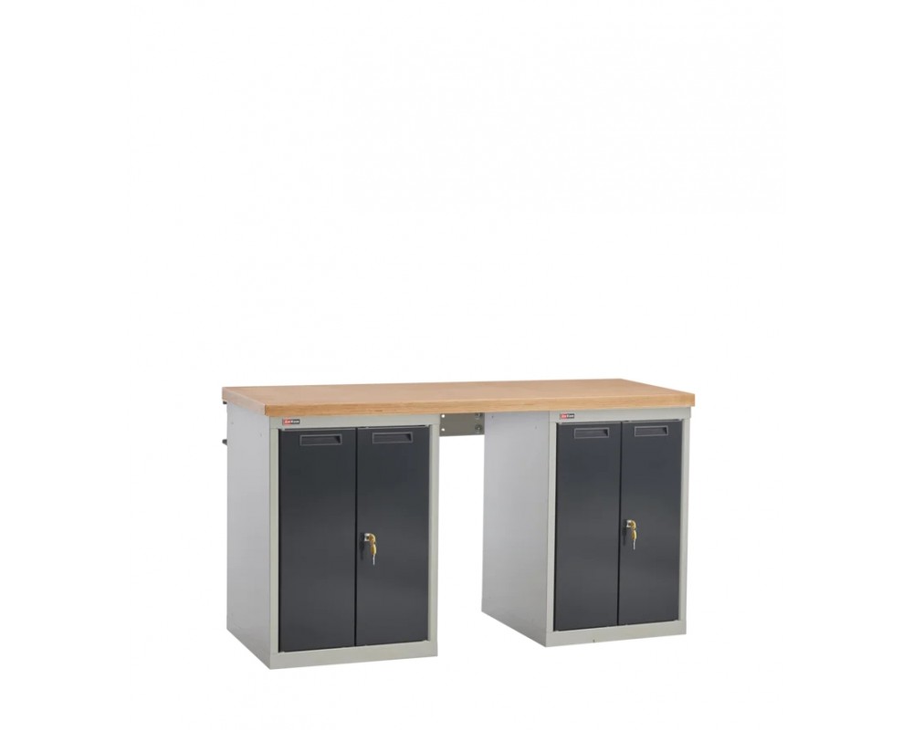 Металлические элементы верстаков окрашены эпоксидной порошковой краской, устойчивой к механическим воздействиям и агрессивным жидкостям. Ящики, дверцы тумб и стойки экрана – цвет темно-синий RAL 250 20 20, остальные элементы – цвет серый RAL 7038.