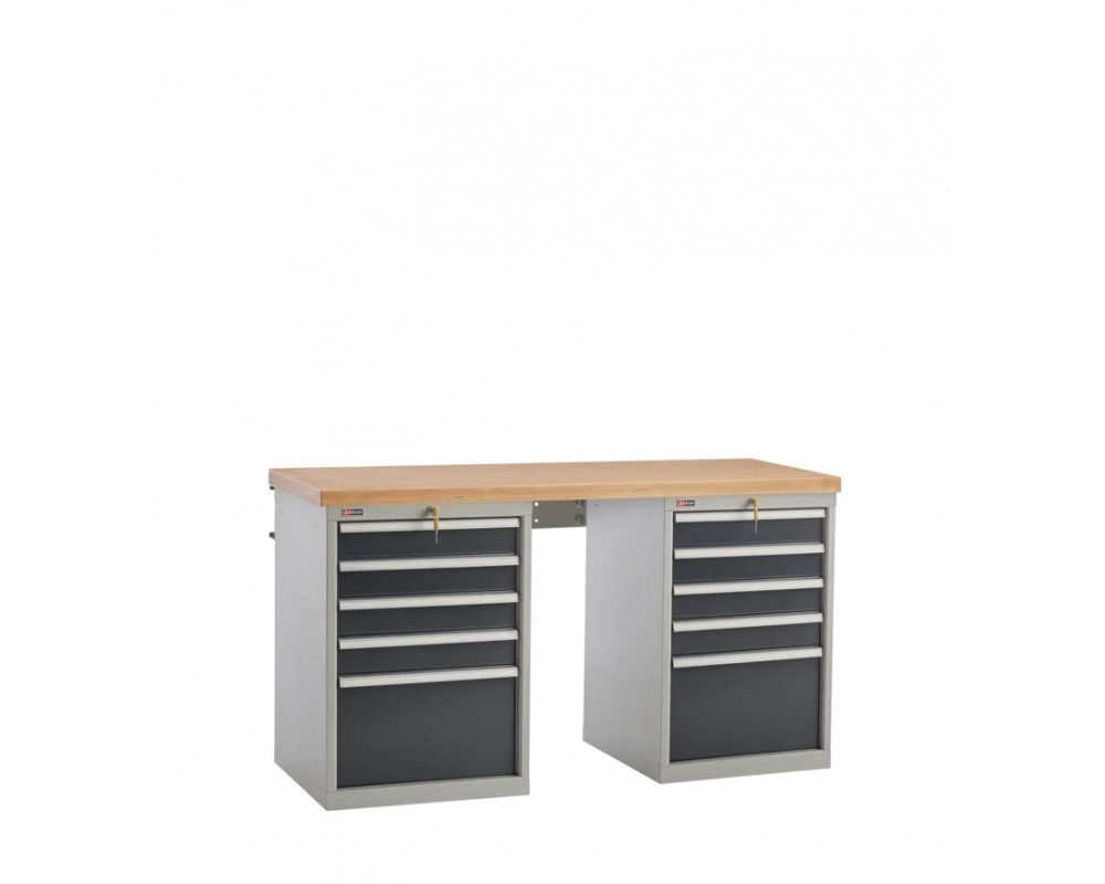Металлические элементы верстаков окрашены эпоксидной порошковой краской, устойчивой к механическим воздействиям и агрессивным жидкостям. Ящики, дверцы тумб и стойки экрана – цвет темно-синий RAL 250 20 20, остальные элементы – цвет серый RAL 7038.