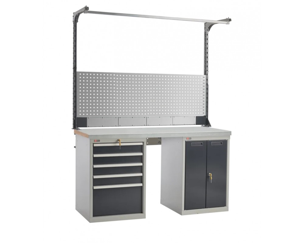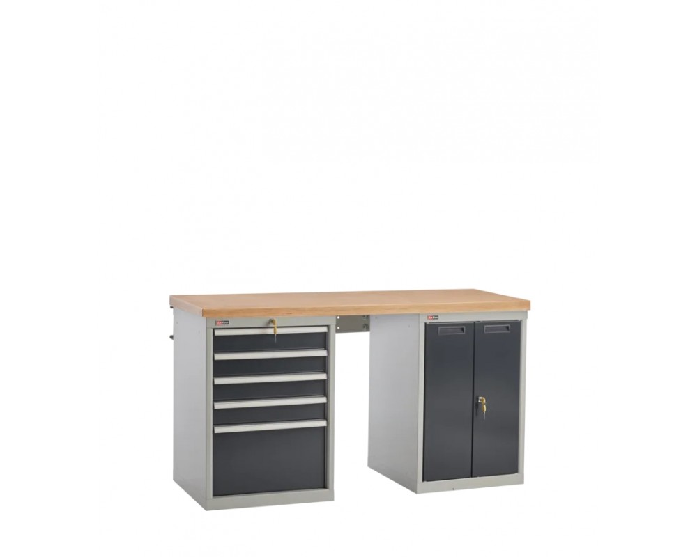 Металлические элементы верстаков окрашены эпоксидной порошковой краской, устойчивой к механическим воздействиям и агрессивным жидкостям. Ящики, дверцы тумб и стойки экрана – цвет темно-синий RAL 250 20 20, остальные элементы – цвет серый RAL 7038.